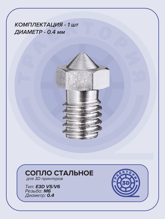 Сопло стальное V6 0.4 мм 100 ₽ В корзину В корзину Сопло для 3D принтера. Материал: сталь Тип: E3D V5/V6 Резьба: M6 Диаметр: 0.4 Сопло для 3D принтера. Материал: сталь Тип: E3D V5/V6 Резьба: M6 Диаметр: 0.4